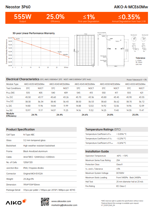 - AIKO Energy 550Wwatt_AllBackContact mit Minimum 24,8% Effizienz. Verschattungsresistent. Das Leistungsstärkste Modul am Markt. Beste Performance Garantiert!